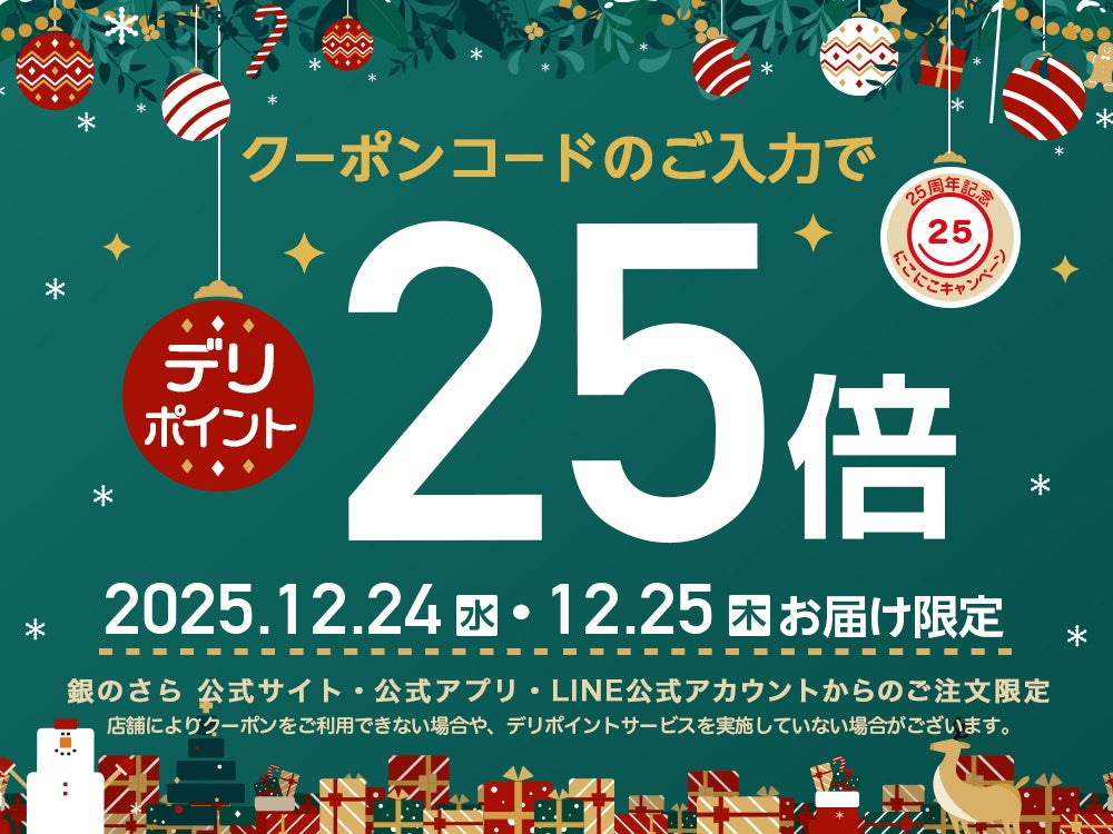 『クリスマスセット』の販売にあわせて、「銀のさら」独自のポイントサービス「デリポイント」では、12月24日(水)・25日(木)のお届け限定で、デリポイントが25倍となるキャンペーンを実施。