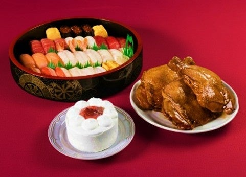 『クリスマスセット』は、人気ネタを盛り込んだ寿司桶に加え、オリジナルのタレで仕上げたローストチキンと、苺ショートケーキをセットにした、クリスマスの食卓に欠かせない料理一式が揃う便利なセットです。