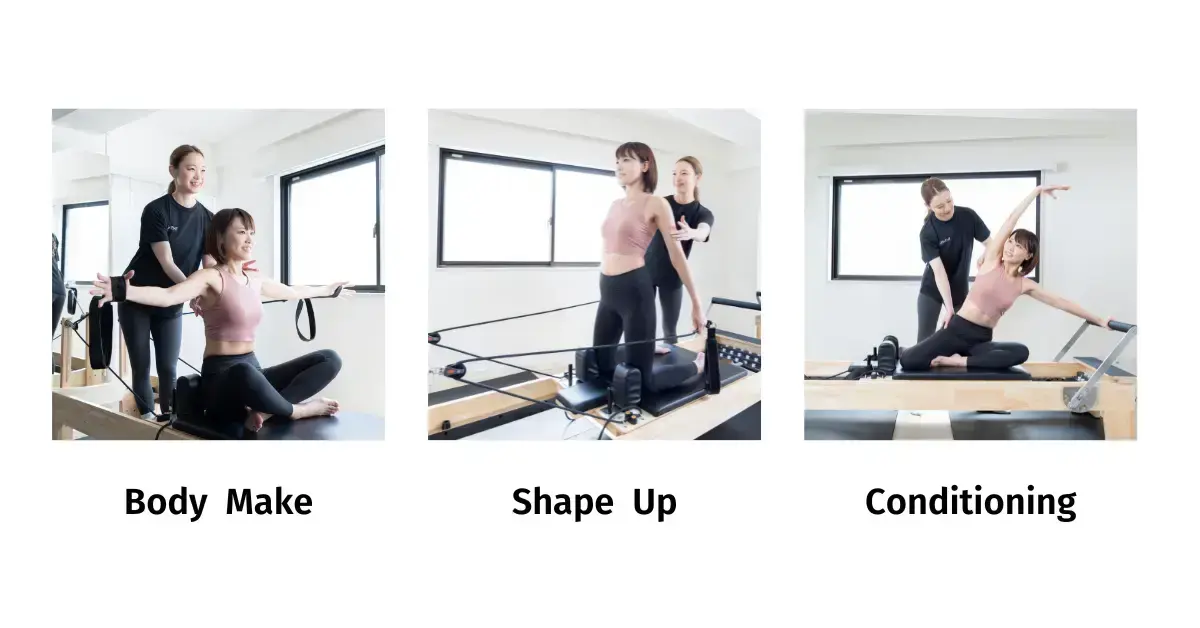 - - 軽重量やピラティスマシンでのトレーニングを中心とし、ウエストラインなど身体の部分でメリハリをつけたいという部位を中心にトレーニングを行います。
