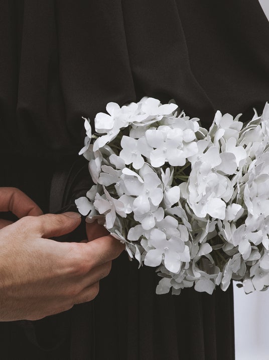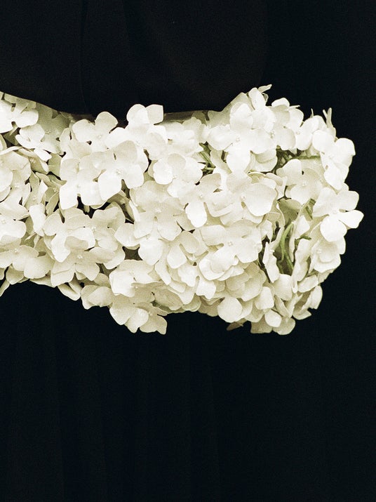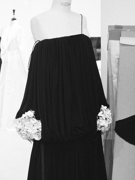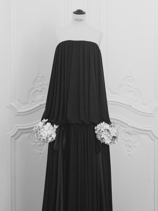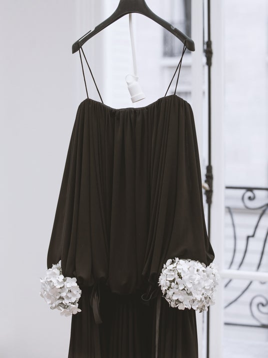 アニャ・テイラー=ジョイは、白いアジサイをあしらったブラックドレープシルクジャージーのビスチェドレスを着用しました。