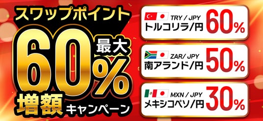 インヴァスト証券株式会社(本社:東京都港区、代表取締役社長:伊藤 誠規、以下「当社」)は、外国為替取引サービス「トライオートFX」において、トルコリラ/円(TRY/JPY)、南アフリカランド/円(ZAR/JPY)、メキシコペソ/円(MXN/JPY)の新規買建玉を対象に、期間中の“建玉増加分”に対してスワップポイントを増額するキャンペーンを2025年12月1日(月)~12月26日(金)まで実施します。