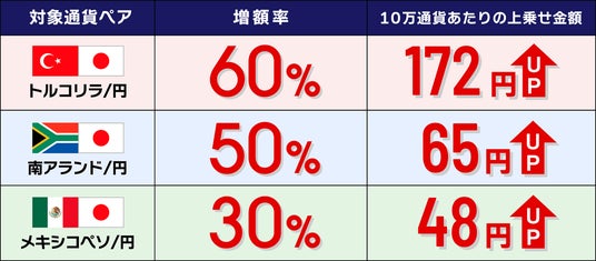 本キャンペーンでは、キャンペーン期間中にお申し込みいただいたお客様を対象に、トルコリラ/円(TRY/JPY)、南アフリカランド/円(ZAR/JPY)、メキシコペソ/円(MXN/JPY)において、基準日(2025年11月28日(金)クローズ時点)時点の保有建玉数量との差分(=増加分の買建玉)について、各営業日ごとにスワップポイントを上乗せしてキャッシュバックします。上乗せ金額は、2025年10月1日~10月31日の受取スワップポイント平均値に対して、各通貨ペアの増額率相当額(小数点第一位四捨五入)です。