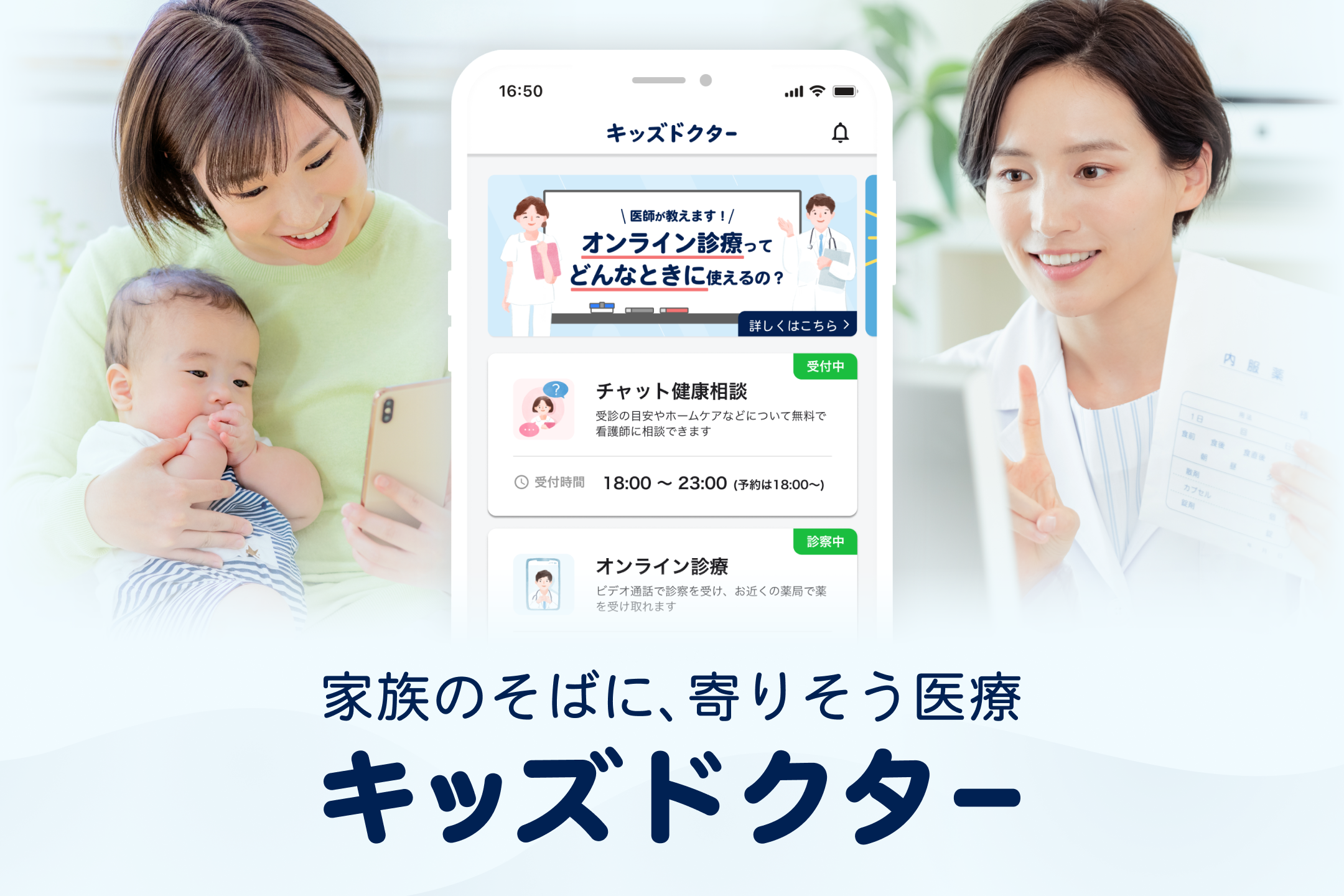 キッズドクター(https://kids-doctor.jp/)は、子どもの健康や病気についてご不安を抱える保護者の方に「医師とつながれる安心」を届けるために生まれた、子どものオンライン診療アプリです。早朝や夜間、休日でも、全国からスマートフォンで医師の診察を受けることができます。オンライン診療の他に、看護師によるチャット健康相談もご利用いただけます。