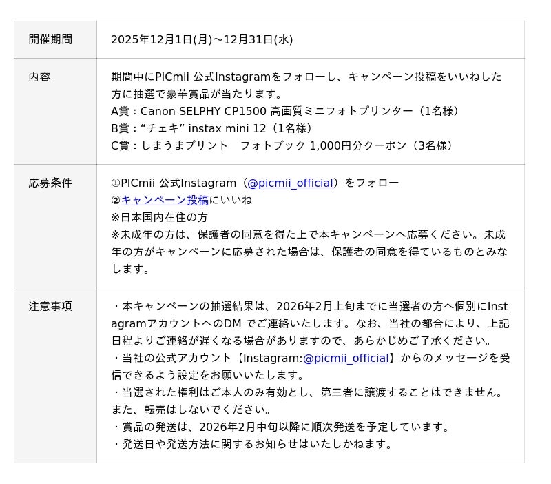 抽選で5名様に、撮った写真をすぐに形にできるスマホ用プリンターや、SNSでも人気の“チェキ” instax mini 12などの豪華賞品をプレゼントいたします。参加方法は、PICmii 公式Instagramをフォローし、キャンペーン投稿に「いいね」をするだけ。この機会にぜひご応募ください。