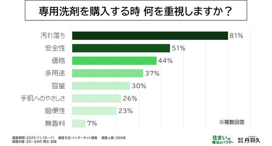 専用洗剤の購入には、汚れ落ち・安全性・価格・多用途を重視。