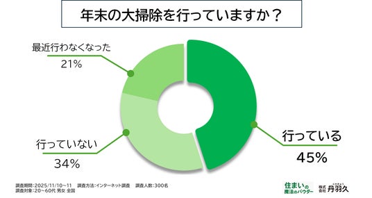 年末の大掃除をするかについて質問したところ、「行っている」が最も多く45%、次いで「行っていない」が34%、「最近行わなくなった」が21%という結果になりました。