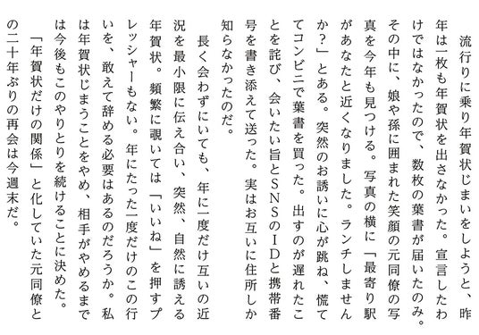 第17回の大賞作品は、年賀状じまいをしようと考えていた作者が、旧友から届いた年賀状のメッセージをきっかけに再び年賀状の良さに気づき、続ける決意とともに旧友に会う約束をするエピソードとなっています。準大賞には、アメリカに移住し心細かった作者が、遠い日本から届く祖父の年賀状に元気をもらうエピソードが受賞。その他、SNSにはない年賀状ならではの有り難さや温かさを感じさせる作品が多数選ばれました。今回を含む過去の受賞作品は、受賞作品発表ページで読むことができます。■第17回 年賀状思い出大賞 大賞作品の紹介