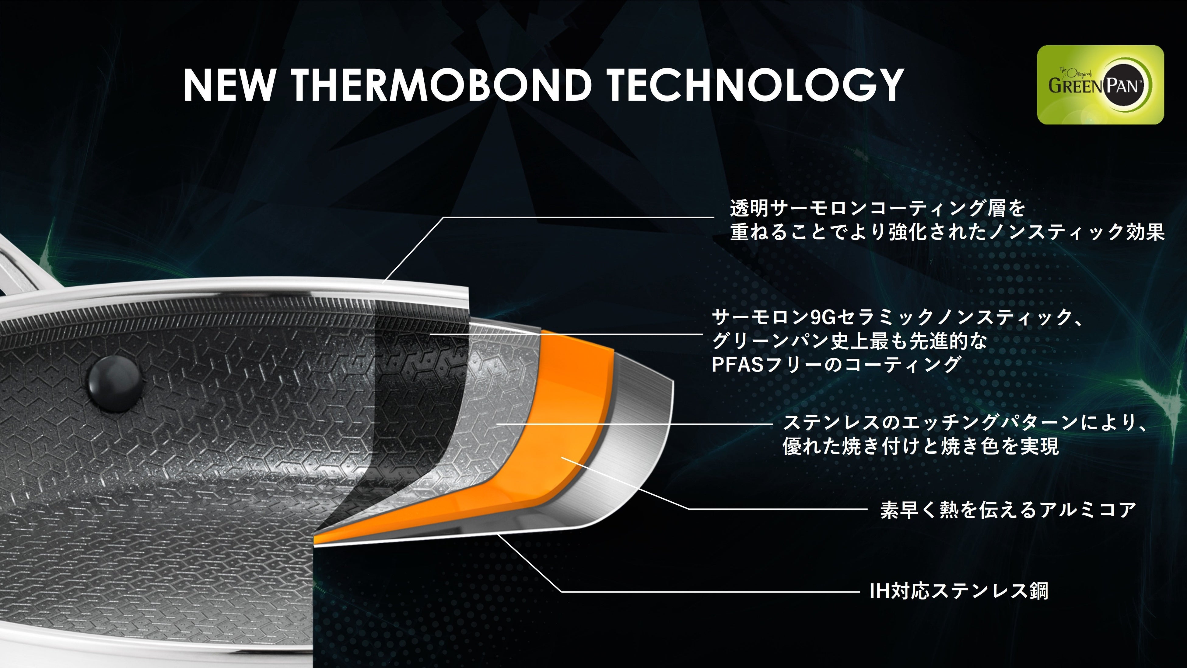 グリーンパンは、セラミック・ノンスティックコーティングのパイオニアとして、ステンレスのタフさとセラミックの扱いやすさを両立させるため、新技術「サーモボンドテクノロジー」を開発 。 プロのような焼き上がりと、驚くほど簡単な洗浄・お手入れを実現する「APEX」が誕生しました。