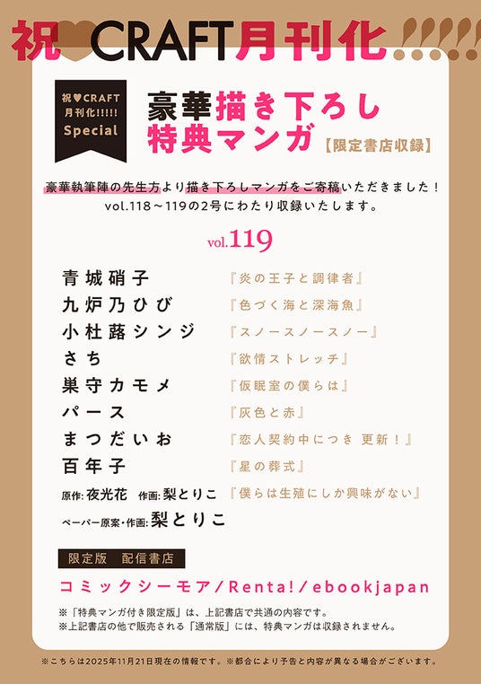 BL電子雑誌『CRAFT』(株式会社大洋図書)の最新号vol.119が、12月1日(月)より各電子書店にて配信されます。