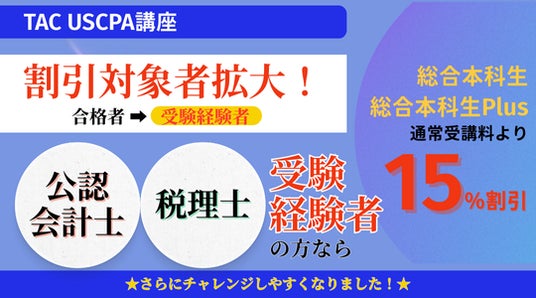 合格者から拡大!受験経験者であればOK!公認会計士・税理士試験の受験経験者であれば、TACでUSCPA対策講座を15%割引でご利用いただけるようになりました。