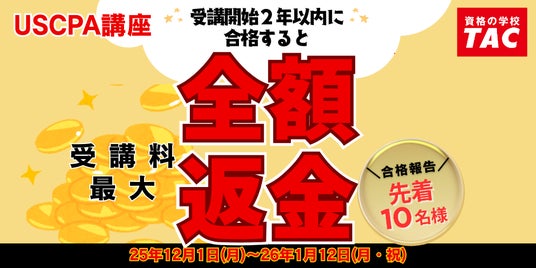 TAC株式会社(東京都千代田区、代表取締役:多田敏男)は、USCPA試験対策講座「【合格報告先着10名】受講料全額返金キャンペーン」を12月1日(月)より開催!受験生を全力サポートいたします!