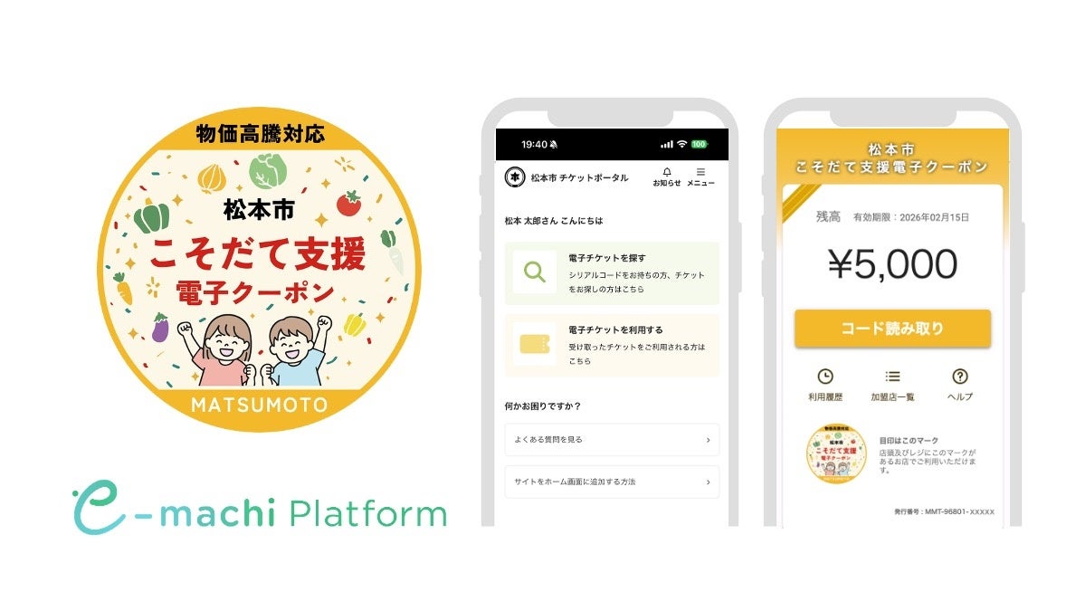 松本市では、2024年3月より、「松本市子育て支援クーポン」を電子化し流通させる運用基盤として、「e街プラットフォーム(R)」のソリューションである「e街ギフトシステム」を活用いただき電子化を実現されています(※3)。また、同じく「e街プラットフォーム(R)」のソリューションであり、自治体の実施する電子商品券を活用した各種施策を集約することで住民による電子商品券の一元的な管理を実現するシステム「e街チケットポータル」を、住民専用のポータルサイト「松本市チケットポータル」の基盤としてあわせて採用をいただいております。さらに、2025年6月に、消防団員の福利厚生の一環として松本市が実施された「消防団施設利用補助クーポン」の発行および運用についても、「e街ギフトシステム」および「e街チケットポータル」をマルチユース展開いただいております(※4)。この度、松本市が子育て世帯を対象に実施される「物価高騰対応子育て世帯電子クーポン配布事業」においても、施策の運用基盤として、「e街ギフトシステム」および「e街チケットポータル」をマルチユース展開いただき、「松本市こそだて支援電子クーポン」の利用が、2025年12月1日(月)から利用が開始されました。なお、本事業は、エネルギー・食料品価格などの物価高騰の影響を受けた生活者や事業者に対し、地方公共団体が地域の実情に応じて必要な施策を実施できるよう内閣府により創設された「重点支援地方交付金」を活用して実施されます。