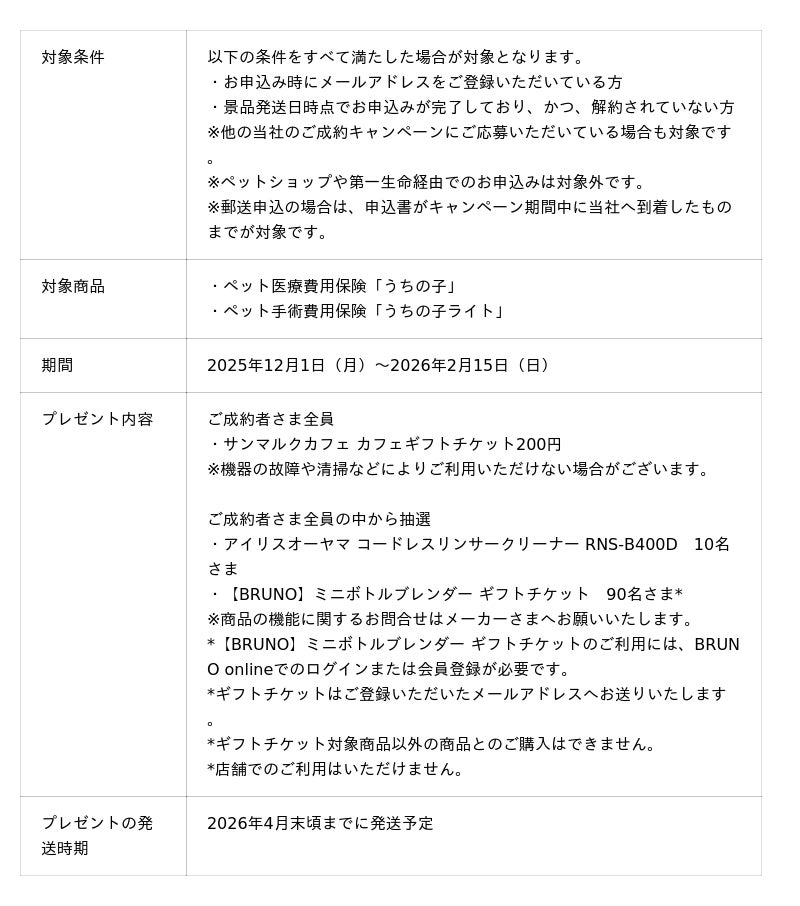 本キャンペーンは、期間中にペット保険にお申込みいただいたご成約者さま全員に、「サンマルクカフェ カフェギフトチケット200円」をプレゼントします。さらに、保有契約件数100万件突破にちなみ、抽選で合計100名さまに豪華景品が当たります。10名さまには布製品の洗浄ができるリンサークリーナー、90名さまには、つくったドリンクをボトルのまま飲めるボトルブレンダーのギフトチケットをプレゼントします。