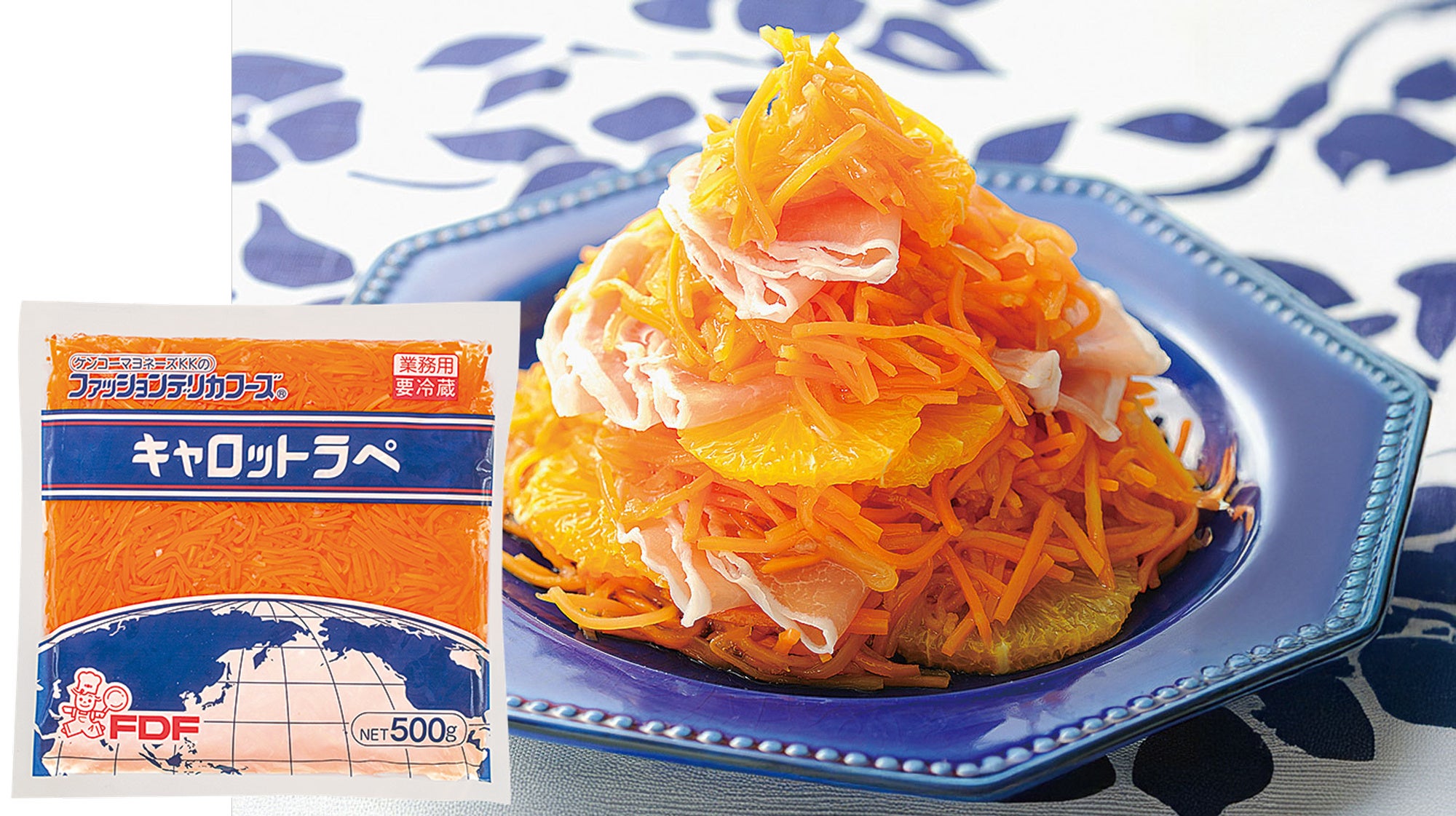 キャロットラペ鮮やかなオレンジ色に心惹かれる「キャロットラペ」は、細切りにしたにんじんをフレンチドレッシングに漬け込むフランスの代表的な定番サラダで、お総菜屋さん、ビストロ、家庭でもよく食べられています。レモンピールをきかせ爽やかな味わいに仕上げました。