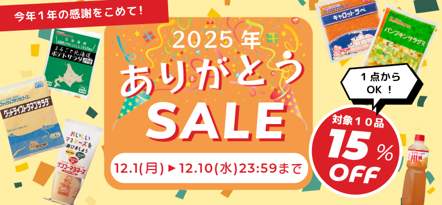 ケンコーマヨネーズ株式会社は、本日から、当社公式通販サイトにおいて「2025年ありがとうSALE」を開始します。12月10日(水)までの限定で、対象商品10品が15%OFFになります。