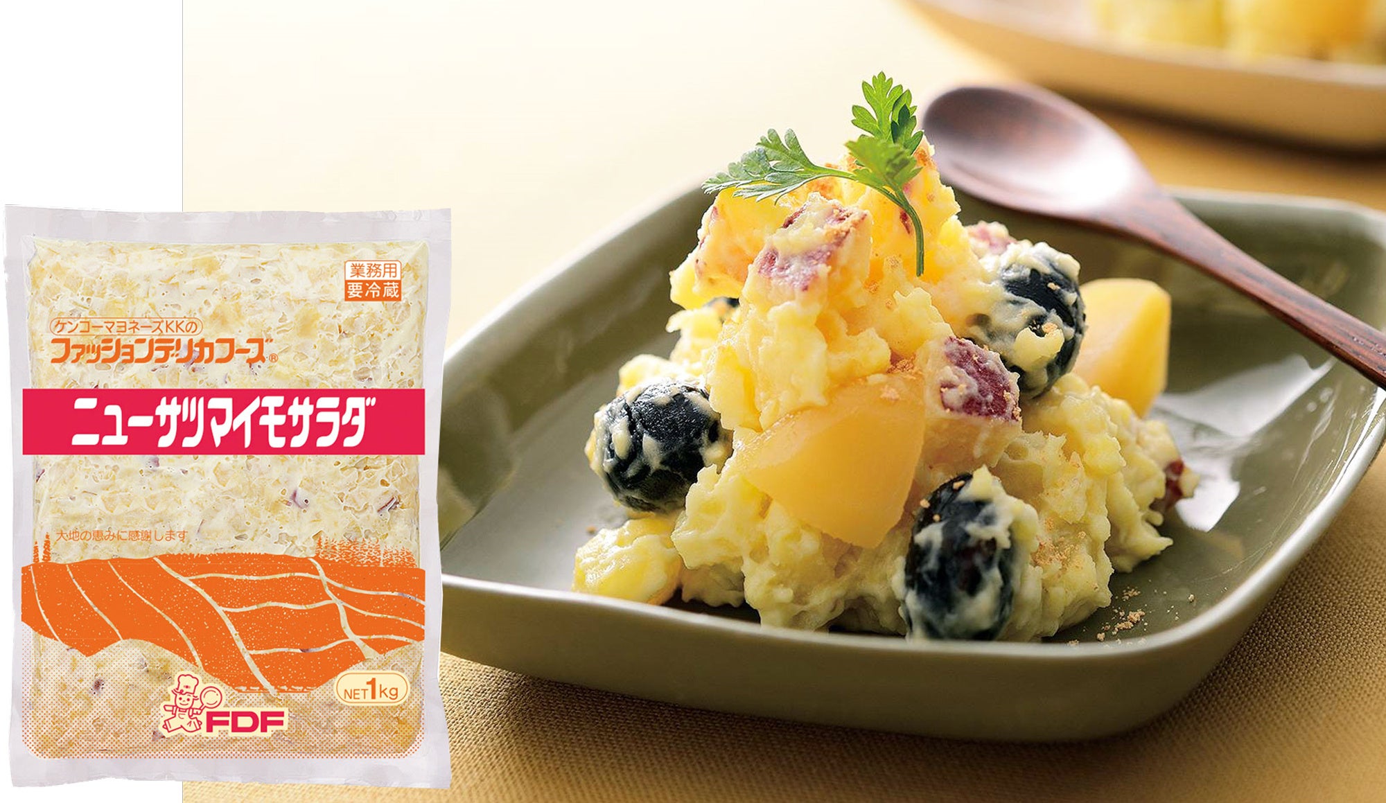 ニューサツマイモサラダ皮ごと10mmの角切りにしたさつまいもを使用し、彩りと存在感を出しました。ホイップクリームやフルーツソースをかけてスイーツサラダにしたり、パン生地に巻き込んで焼くなど、幅広くお使いいただけます。