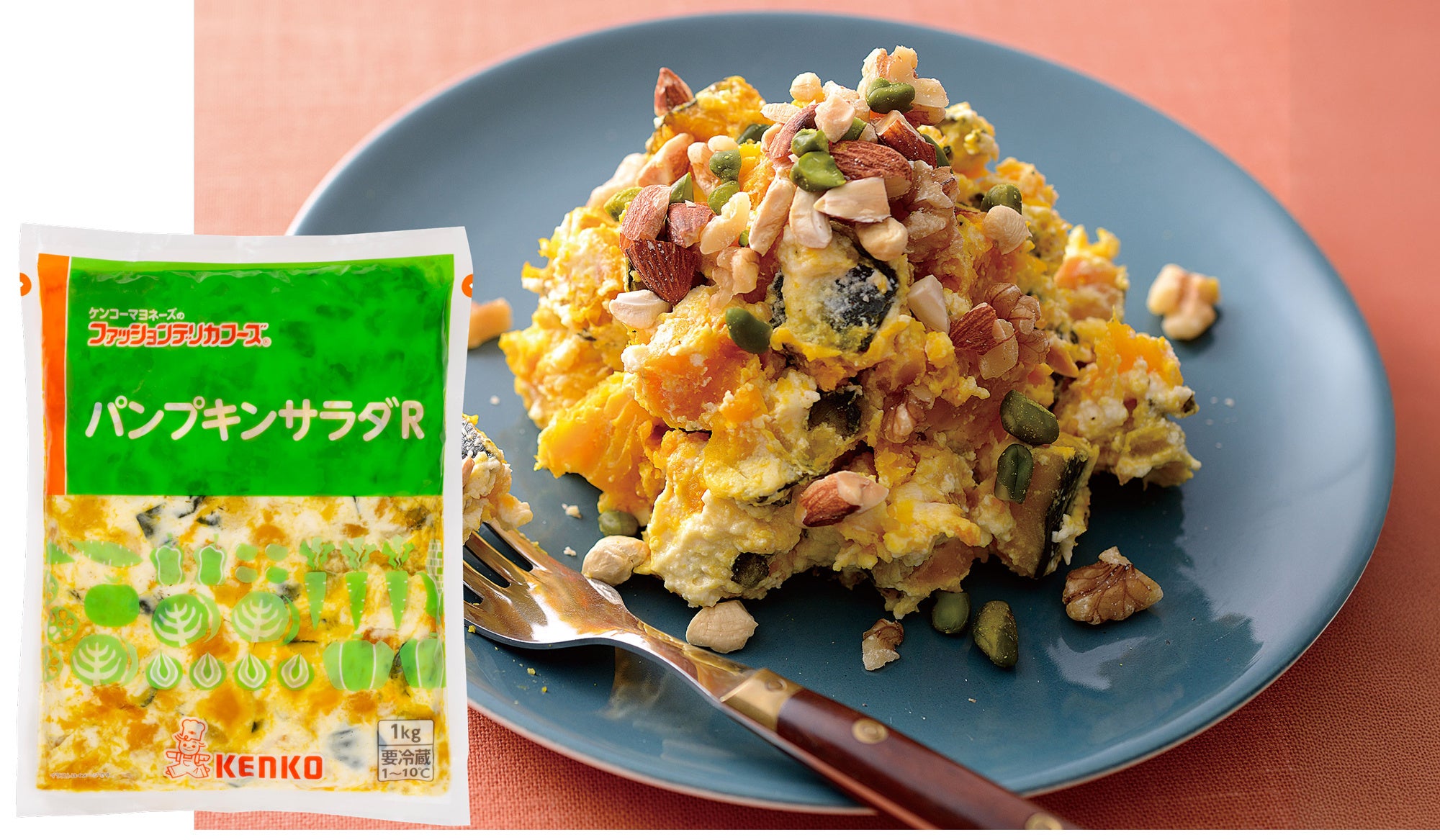 パンプキンサラダRゴロゴロとしたかぼちゃをクリーミーな専用ソースで合わせました。食べ応えがあり、甘味のあるかぼちゃが幅広い層に人気のサラダです。
