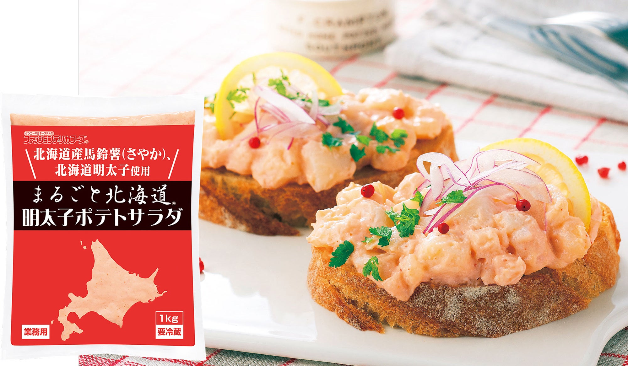 まるごと北海道(R)明太子ポテトサラダ北海道明太子と北海道産ばれいしょを使用した海と大地の絶品コラボレーションです。強い旨味とまろやかな辛味の明太子が、サラダはもちろんホットメニューでも程良いアクセントになります。焼いてもきれいな色合いです。