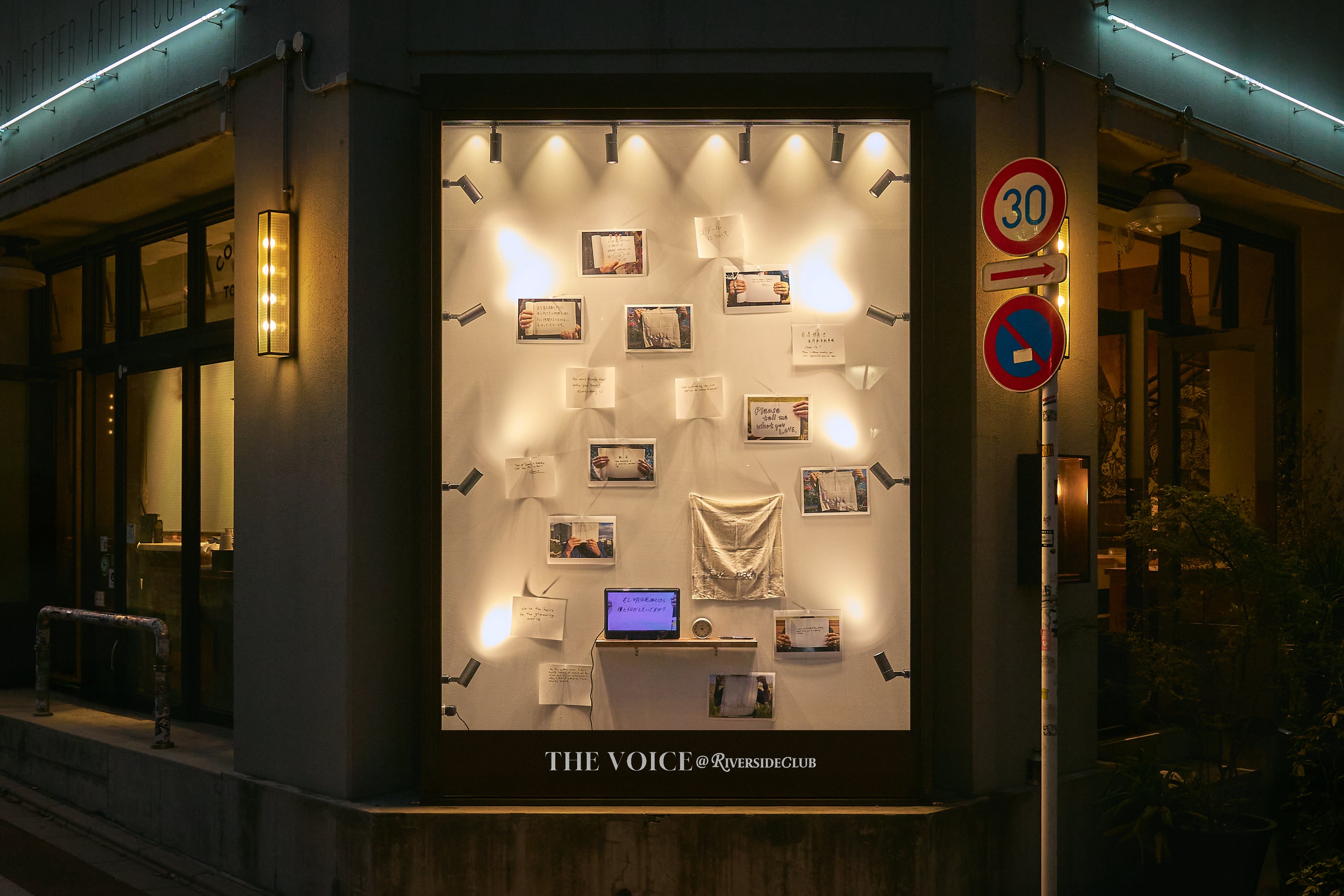 カルチャー・ハブとしての役割を強めるため、RIVERSIDE CLUBではアートに関わる取り組みも本格的に拡張しました。店外の壁面ウインドウでは、アーティスト・稲垣直子によるアートプロジェクト「THE VOICE」を始動。3ヶ月ごとに更新されるこの展示は、街ゆく人々に社会的メッセージを投げかける“公共のキャンバス”として機能します。約13インチのスクリーンに映し出される映像と文字が、日常の風景の中に静かな問いを生み出し、街のなかに新しい会話のきっかけをつくり出します。