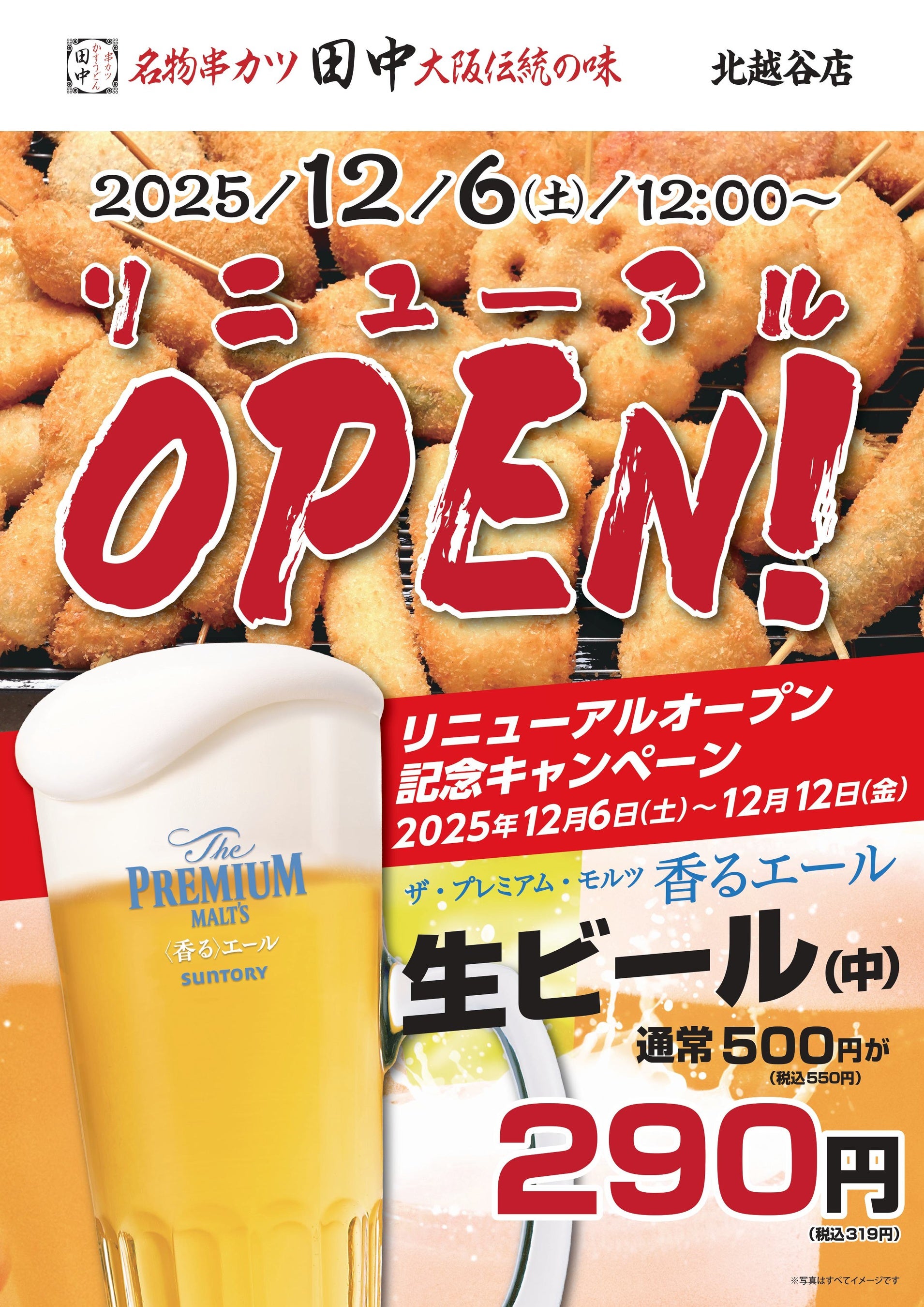 「“楽しい”でつながる世界をつくる」をミッションとする株式会社ファイブグループ(本社:東京都武蔵野市、代表取締役社長:坂本憲史)は、2025年12月6日(土)に「串カツ田中 北越谷店」をリニューアルオープンいたします。