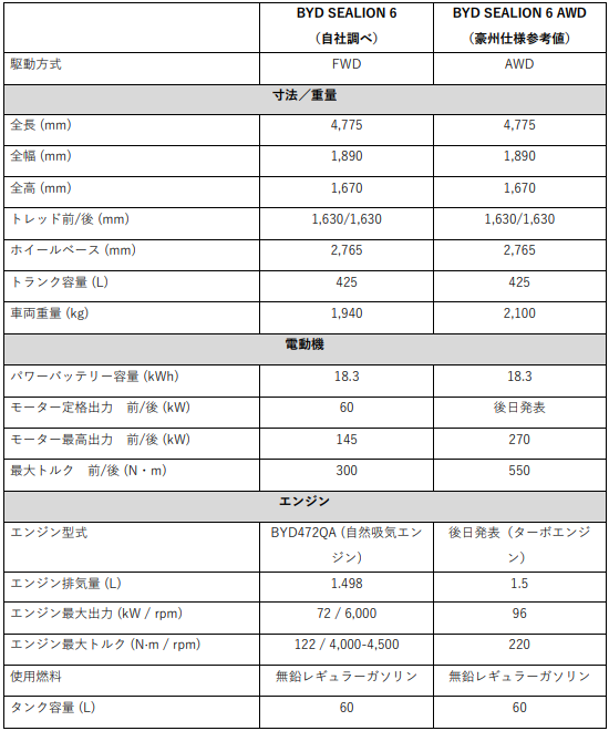 ■BYD SEALION 6の主要諸元(抜粋版)