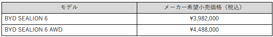 「BYD SEALION 6」は、前輪駆動の「BYD SEALION 6」と四輪駆動の「BYD SEALION 6 AWD」の2グレード展開です。全国メーカー希望小売価格は、BYD SEALION 6が398.2万円(税込)、BYD SEALION 6 AWDが448.8万円(税込)です。
