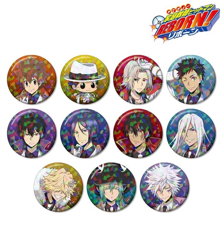 沢田 綱吉 、リボーン、獄寺 隼人(10年後)、山本 武(10年後)、雲雀 恭弥(10年後)、六道 骸(10年後)、笹川 了平(10年後)、大人ランボ、ディーノ(10年後)、XANXUS (10年後)、スペルビ・スクアーロ(10年後)、ベルフェゴール(10年後)、フランのイラストを新たなタッチで魅力的に表現し、グリッター加工を施した缶バッジに仕上げました。