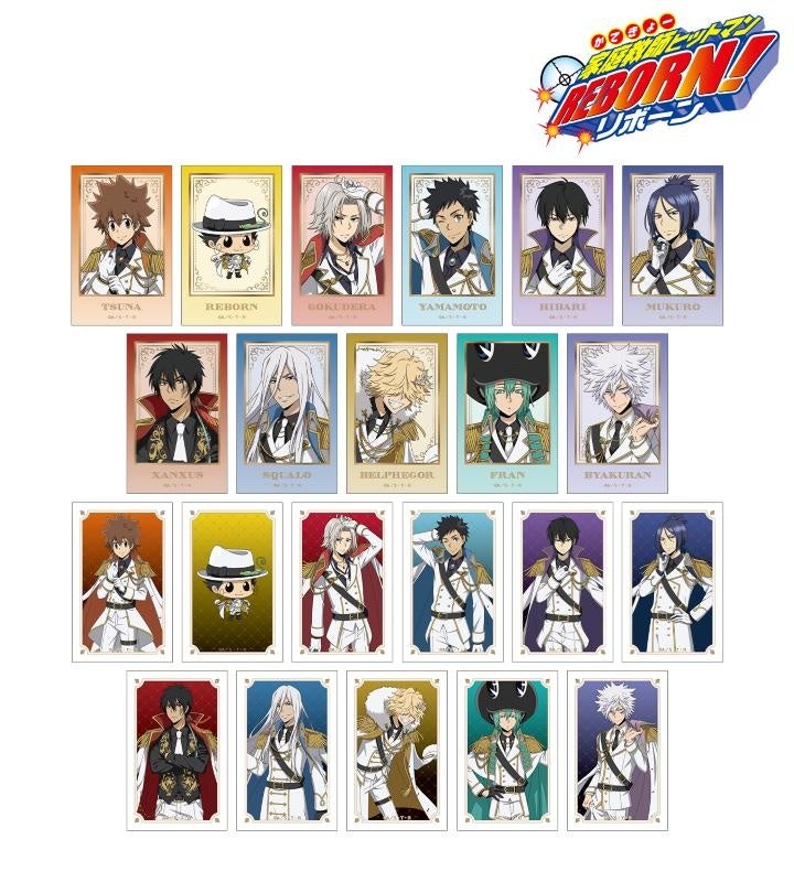沢田 綱吉 、リボーン、獄寺 隼人(10年後)、山本 武(10年後)、雲雀 恭弥(10年後)、大人ランボ、笹川 了平(10年後)、六道 骸(10年後)、ディーノ(10年後)、XANXUS (10年後)、スペルビ・スクアーロ(10年後)、ベルフェゴール(10年後)、フランのイラストを新たなタッチで魅力的に表現し、イラストカードに仕上げました。
