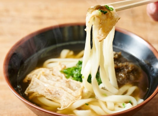 串カツ田中の名物「かすうどん」。田中特製のお出汁に油かすの旨味が溶け込んだ逸品です。