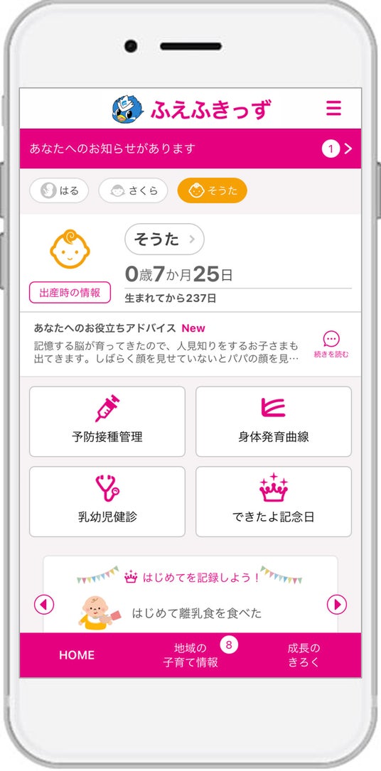 笛吹市に採用された『ふえふきっず』は、スマートフォン・タブレット端末・PCに対応したサービスで、妊産婦と子どもの健康データの記録・管理や予防接種のスケジュール管理、出産・育児に関するアドバイスの提供、離れた地域に住む祖父母など家族との共有機能や、市が配信する地域の情報をお知らせするなど、育児や仕事に忙しい母親や父親を助けてくれる便利な機能が充実しています。