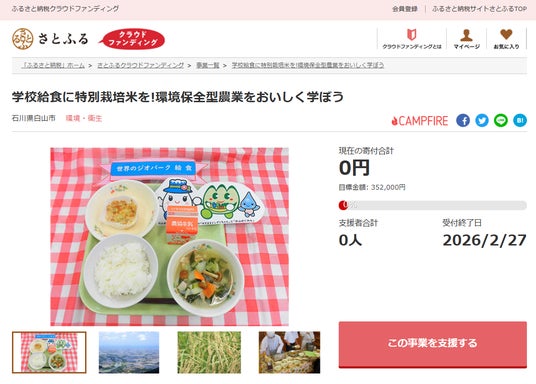 石川県白山市とふるさと納税ポータルサイト「さとふる」を運営する株式会社さとふる(本社:東京都中央区、代表取締役社長 兼 CEO:藤井 宏明)は、「さとふるクラウドファンディング」にて、「学校給食に特別栽培米を!環境保全型農業をおいしく学ぼう」の寄付受け付けを2025年12月1日より開始します。