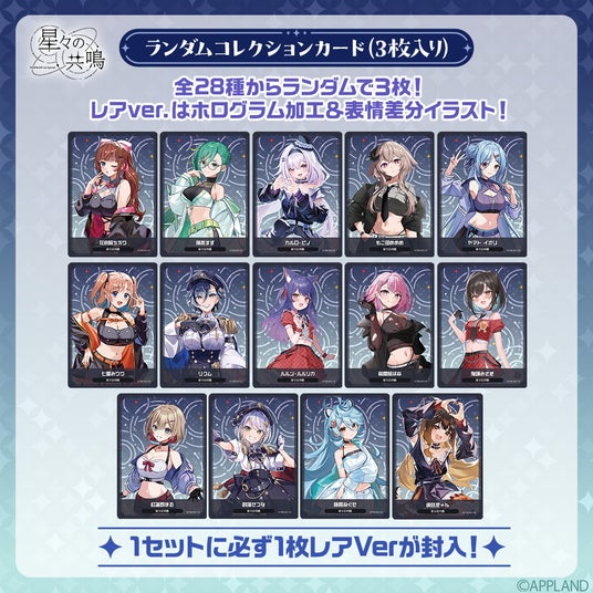 「.LIVE」より花京院ちえり、神楽すず、カルロ・ピノ、もこ田めめめ、ヤマト イオリ、七星みりり、リクム、ルルン・ルルリカ、「ぶいぱい」より鬼頭みさき、紅蓮罰まる、斜落せつな、秘間慈ぱね・遠吠きゃん・綿貫ねぐせが出演する『星々の共鳴』のグッズが9種類登場!タッグごとの描き下ろしイラストをお楽しみください!