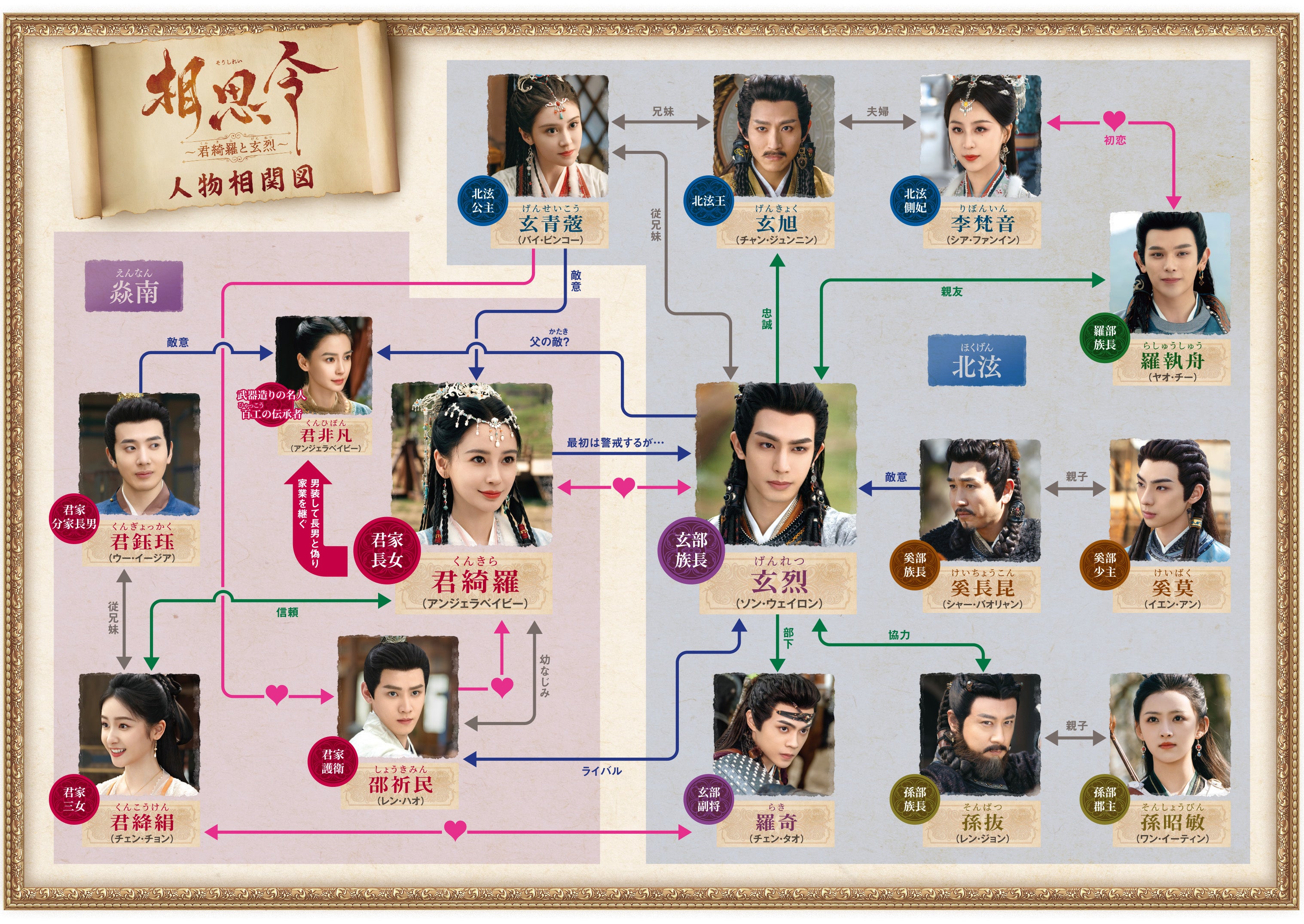 君綺羅にとっては幼なじみであり家族のような存在の護衛・邵祈民(しょうきみん)を「春家(しゅんけ)はトキメキざかり~四つ葉に咲く恋~」のレン・ハオが演じ、君綺羅の運命の恋人・玄烈と三角関係を繰り広げるほか、「流水舞花(りゅうすいまいか)~遥かなる月落城~」ヤオ・チーと「永安夢~君の涙には逆らえない~」シア・ファンインが覇権争いに翻弄された恋人同士を熱演。彼らの切ない恋は涙なしには見られない! さらに「祈今朝<ききんちょう>~失われた記憶、共鳴する愛~」バイ・ビンコー、「安楽伝」のチェン・タオ、ワン・イーティンら注目の若手がキーマンとなるキャラクターを好演! 複雑に絡み合う恋模様や友情、忠誠心、家族の絆など心揺さぶる数々のエピソードも見どころ!