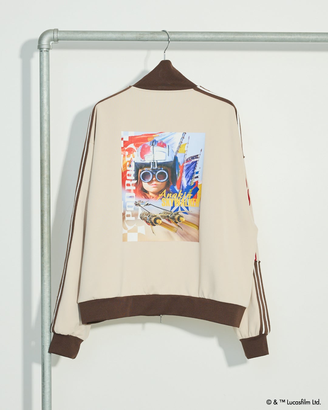 注目のトラックジャケットは、エピソード1から3の主人公「アナキン・スカイウォーカー」が自作のポッドレーサーでレースに挑むシーンをバックプリントで表現。『スターウォーズ』の世界観をそのままに、ストリートテイストを効かせた遊び心あふれるデザインに仕上げました。