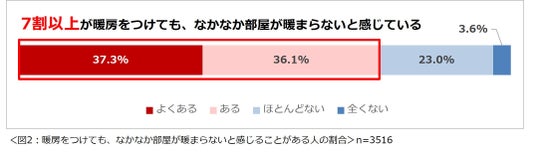 暖房を使用している3516名に、「暖房をつけても、なかなか部屋が暖まらないと感じることはありますか?」と尋ねたところ、「よくある」が37.3%、「ある」が36.1%で、合わせて7割以上の人が暖房をつけても、なかなか部屋が暖まらないと感じていることが分かりました。(図2)