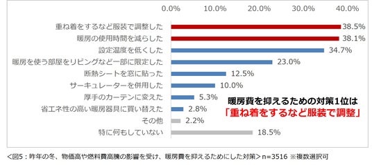 また、「昨年の冬、物価高や燃料費高騰の影響を受け、暖房費を抑えるための対策をしましたか?」と尋ねたところ、1位「重ね着をするなど服装で調整した」(38.5%)、2位「暖房の使用時間を減らした」(38.1%)と回答が続いた一方、特に何もしていない人も約2割いました。(図5)