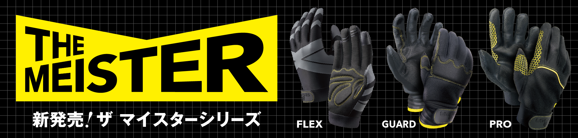 倉庫作業、建設、車両メンテナンスなどのプロフェッショナルな現場における安全性と作業効率への要求は、年々高まっています。多様化するニーズに応えるため、当社はこれまで取り扱いのなかった合成皮革手袋「THE MEISTER(ザ マイスター)」シリーズを発売することにいたしました。同シリーズは、手首部にフィット感を調整できる面ファスナーを採用。「FLEX(フレックス)」、「GUARD(ガード)」、「PRO(プロ)」の3モデルをラインナップし、繊細な作業から過酷な環境まで、幅広い現場の安全と生産性向上をサポートいたします。