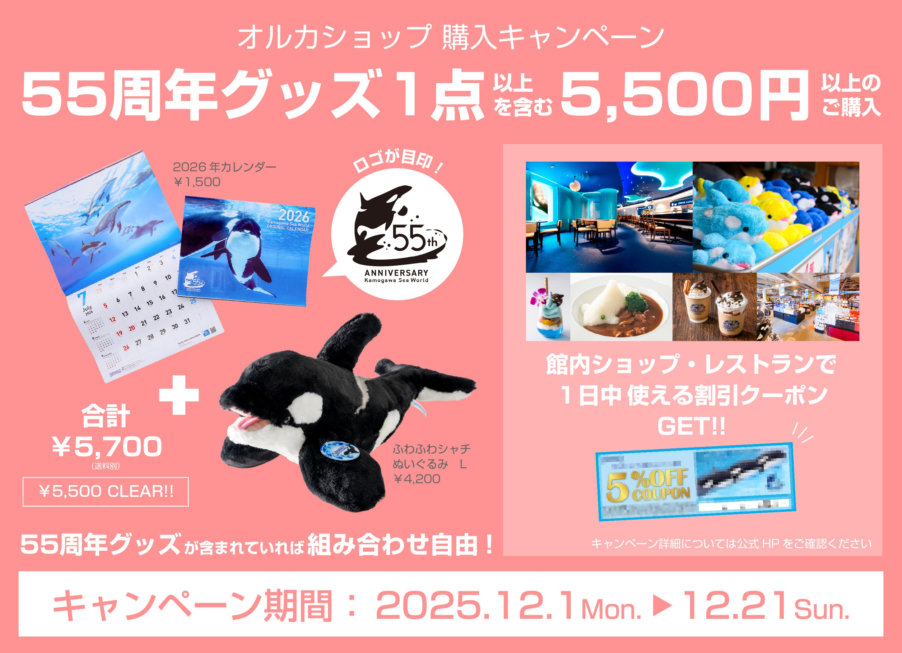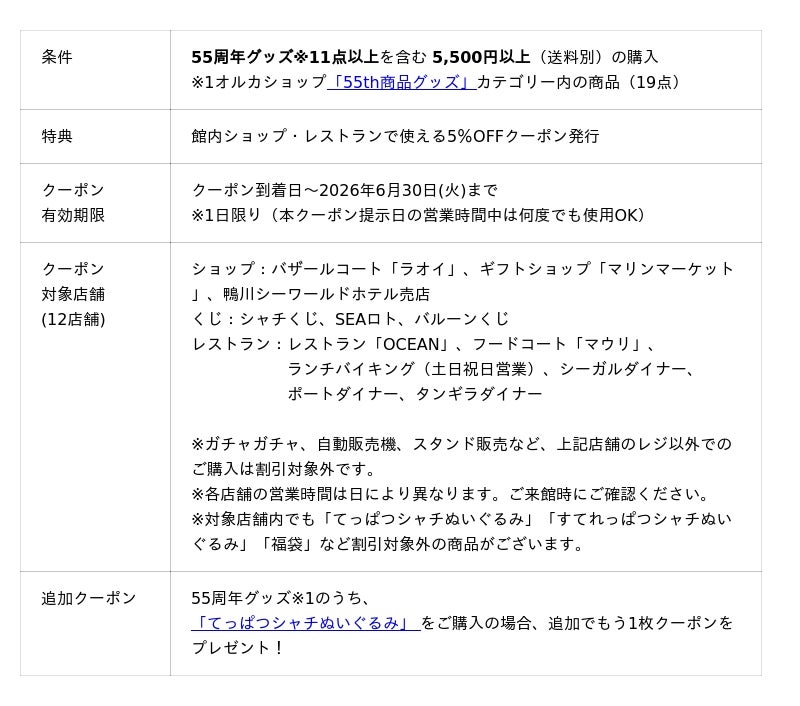 今回のキャンペーンは、「オルカショップ」で、55周年記念グッズ1点以上※1を含む5,500円以上(送料別)ご購入のお客様を対象に、次回ご来館時のレストラン・ショップ(各くじを含む)直営店舗でのお買い物が5%引きになる限定クーポンを商品と共にお届けします。