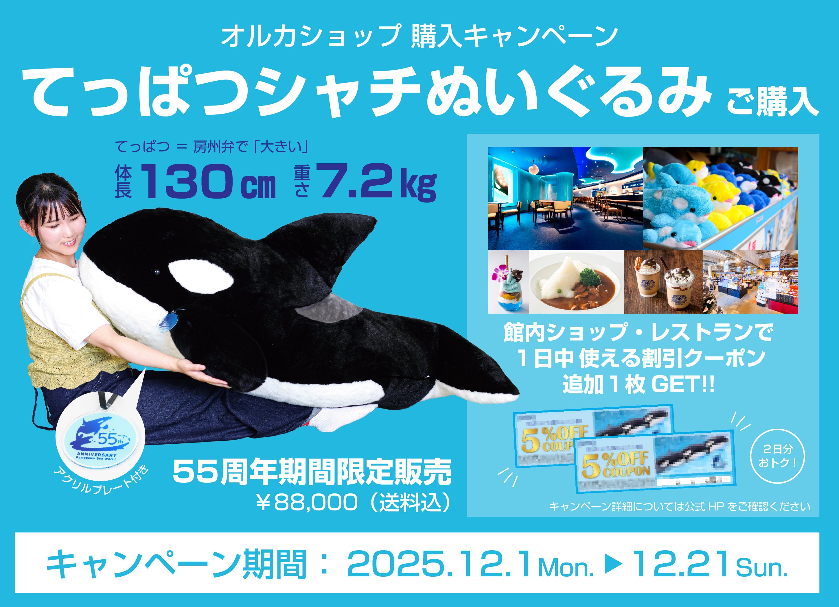 さらに、55周年を記念し期間限定で販売している「てっぱつシャチぬいぐるみ」(約130cm/約7.2kg)をご購入の場合、追加でもう1枚クーポンをプレゼントします。てっぱつシャチぬいぐるみが気になっていた方はぜひこの機会にお買い求めください。