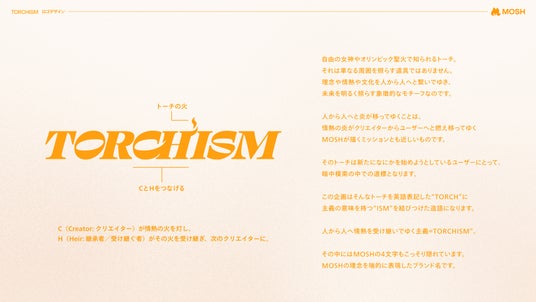 情熱に満ちた個人が活躍し、それを支持する人々が経済活動を循環させる時代が目前に来ています。MOSHはプラットフォームの提供のみならず、この「情熱のリレー」を促進するTORCHISMのような企画を通じ、新しい学び方・働き方・経済の在り方を提案していきます。