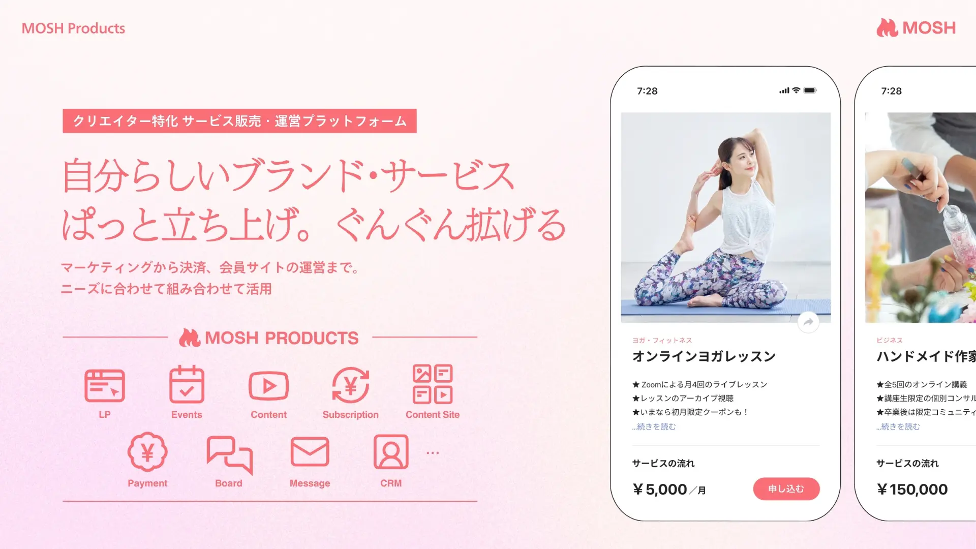 MOSH株式会社は、2017年に設立しサービスEC領域において国内唯一のオールインワンプロダクトを提供する企業です。「情熱がめぐる経済をつくる」というミッションを掲げ、個人クリエイター向けに多機能なプラットフォームを提供しています。現在、200を超えるカテゴリー、85,000人を超えるクリエイターがMOSHを活用しており、年間流通総額は150億を突破し成長しています。