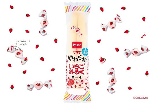 ふんわりやわらかい白焼きのパン生地で、「いちごみるく」を砕いたキャンディ入りクリームをはさんでいます。キャンディが溶けにくいようクリームの配合を工夫しているため、“シャリシャリ”とした食感と「いちごみるく」の味わいをしっかりと感じられます。パッケージでは、「いちごみるく」の袋をイメージしたカラフルなデザインを採用しました。おいしく・たのしく・かわいく仕上げた「やわらかいちごみるくロール」を、是非お楽しみください。