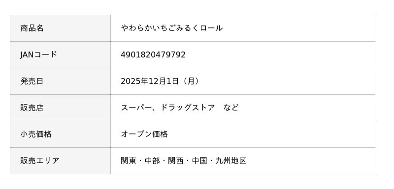 敷島製パン株式会社(Pasco)は、「やわらかいちごみるくロール」を2025年12月1日(月)より、関東・中部・関西・中国・九州地区にて発売します。