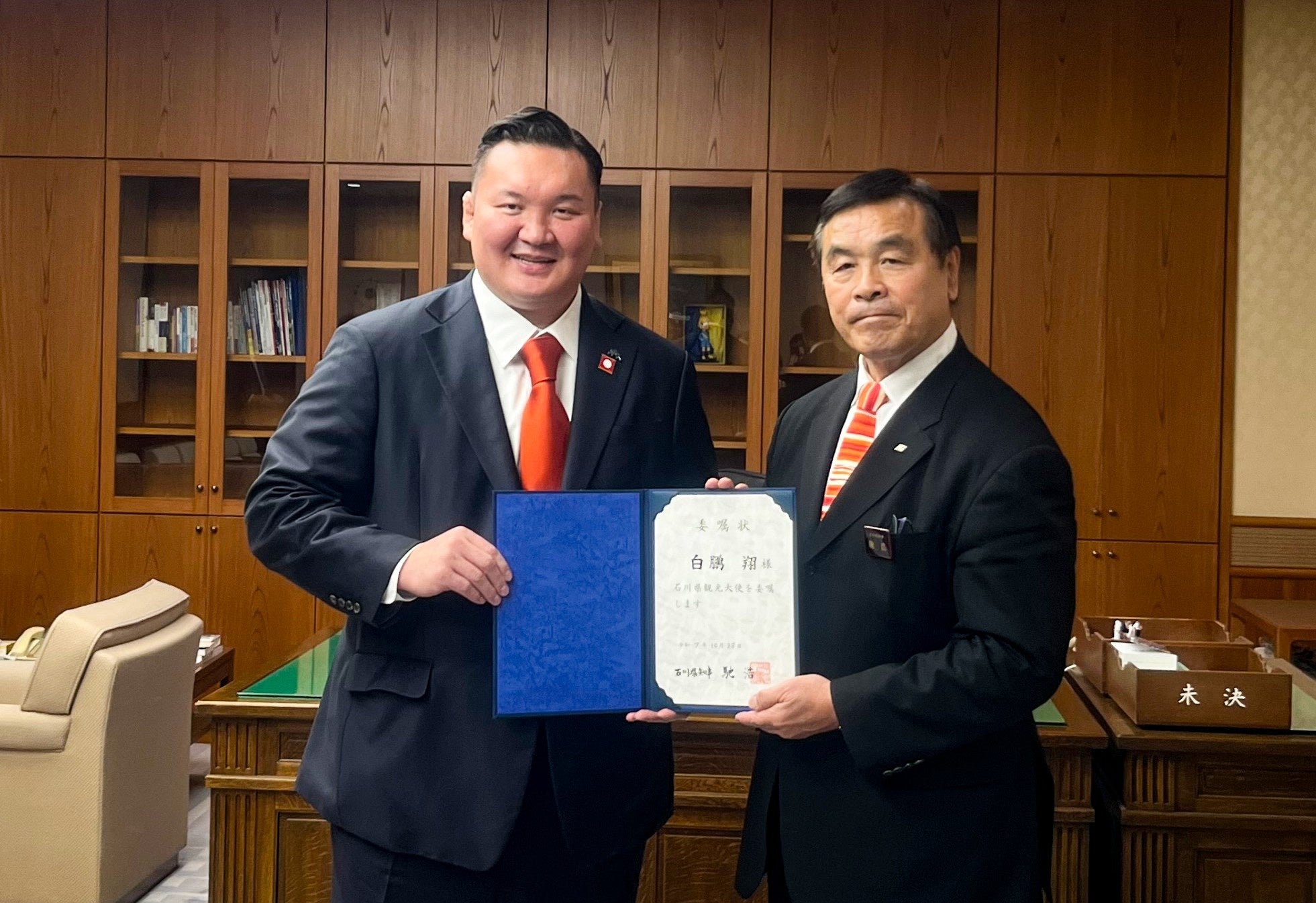 「相撲王国・石川の名に恥じないよう、地域と世界をつなぐ存在でありたい」と述べ、馳浩知事から委嘱状を受け取りました。次回白鵬杯では、被災地・能登の子どもたちを特別招待し、スポーツを通じた地域復興と国際交流を実践してまいります。