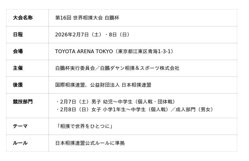 白鵬ダヤン相撲&スポーツ株式会社(代表:白鵬翔/東京都)は、少年少女および一般を対象とした国際相撲大会「第16回 白鵬杯」を、2026年2月7日(土)・8日(日)の2日間、TOYOTA ARENA TOKYO(東京都江東区)にて開催いたします。