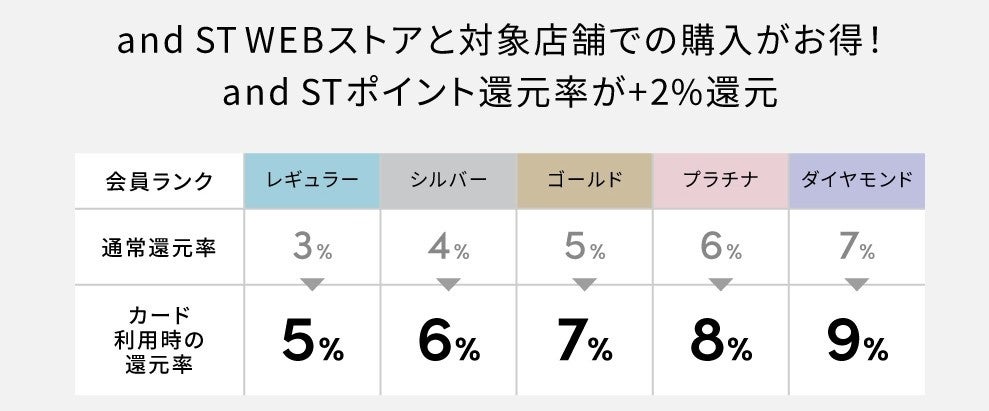 アンドエスティHDグループ店舗および公式WEBストア and STのご利用で、お客さまのand ST会員ランクに応じて、5%~最大9%のand STポイントが貯まります。