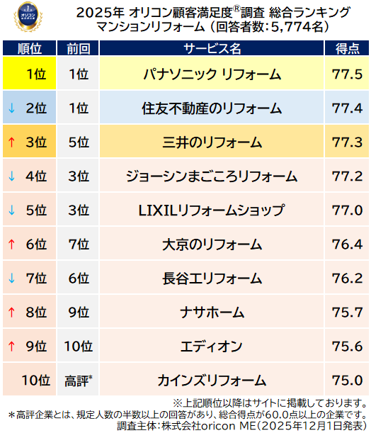 2025年 オリコン顧客満足度(R)調査 マンションリフォーム(https://life.oricon.co.jp/rank_reform/mansion/)