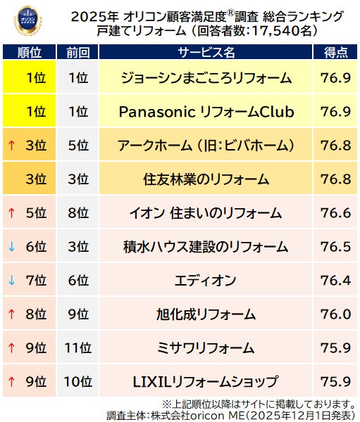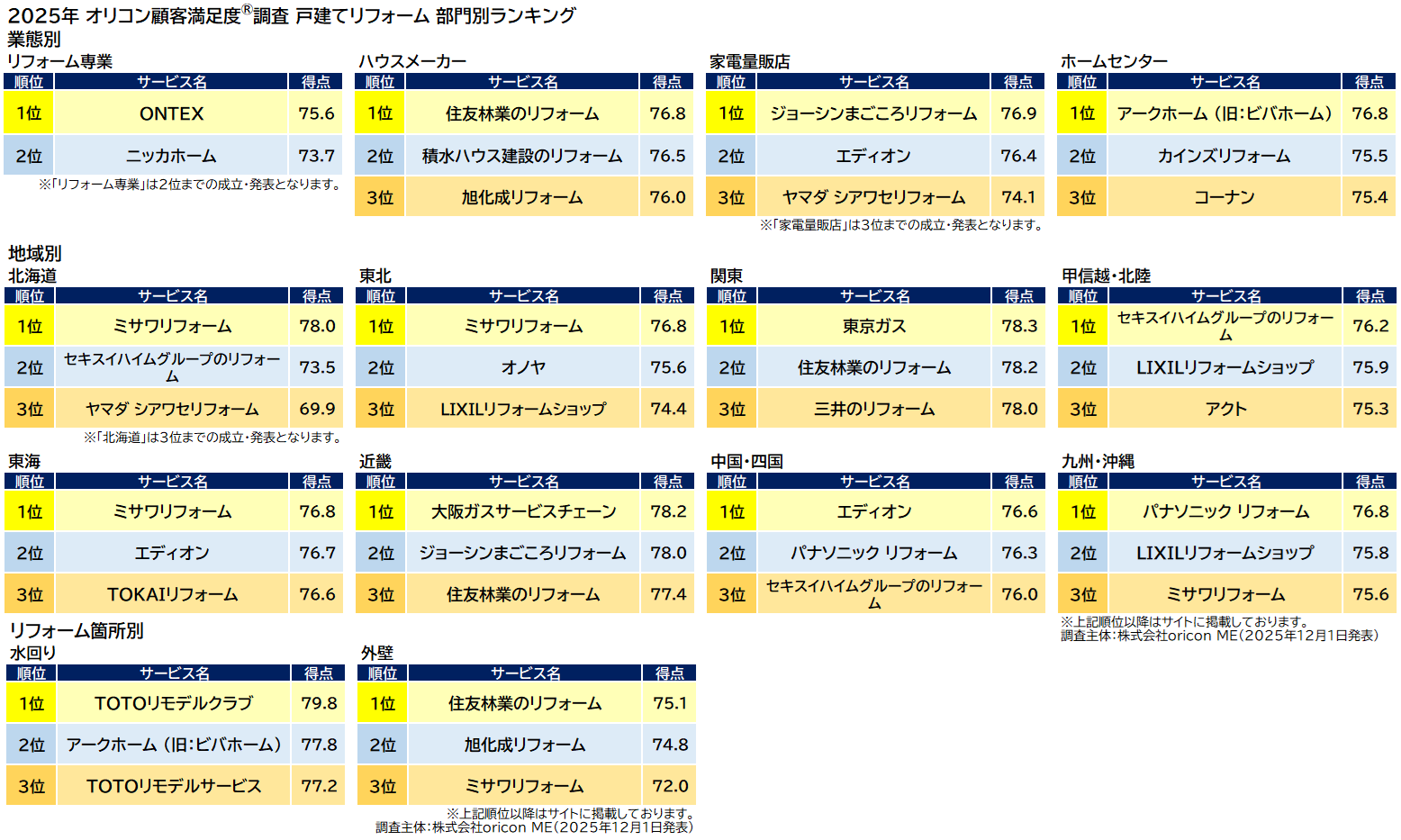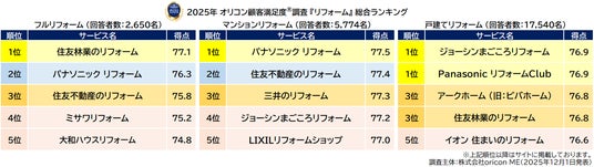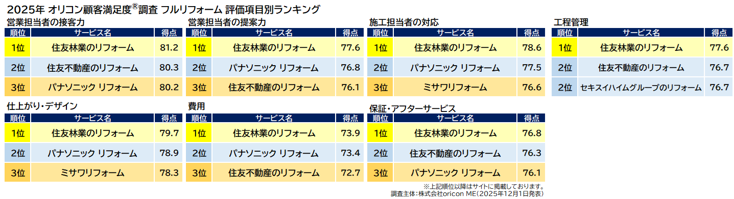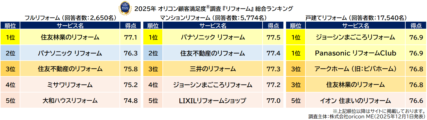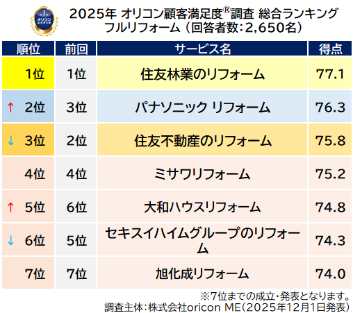 2025年 オリコン顧客満足度(R)調査 フルリフォーム (https://life.oricon.co.jp/rank_reform/large/)