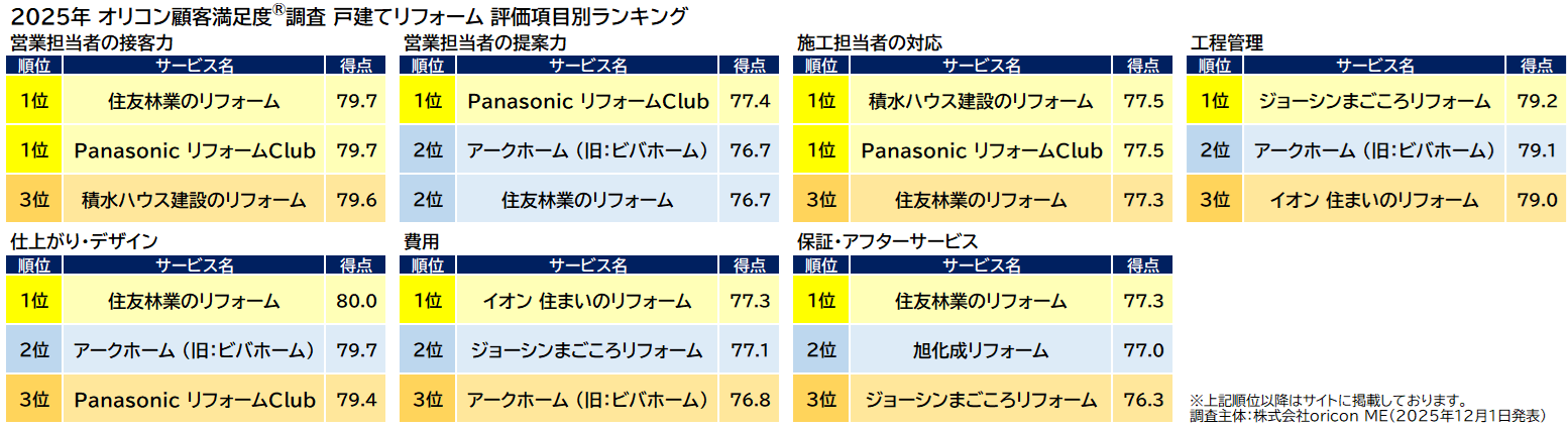 戸建てリフォーム 評価項目別ランキング(オリコン顧客満足度調査)