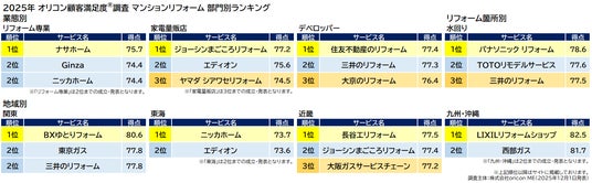 マンションリフォーム 部門別ランキング(オリコン顧客満足度調査)